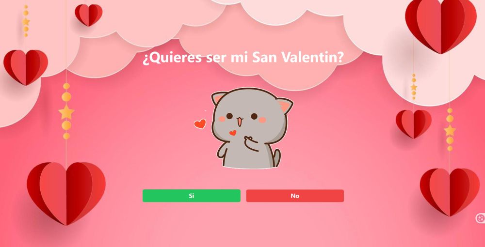 Es una forma clásica y tradicional de invitar a alguien a ser tu pareja o acompañante especial durante el Día de San Valentín El formato de "Sí/No" hace que sea fácil de responder y reduce la presión sobre la persona que recibe la invitación Refleja una aproximación romántica directa pero respetuosa Uso común: Este tipo de mensaje se utiliza frecuentemente en: Tarjetas de San Valentín Mensajes románticos Invitaciones casuales entre personas que se están conociendo Expresiones de cariño entre parejas establecidas ¿Te gustaría que profundice en algún aspecto específico de este contenido?
